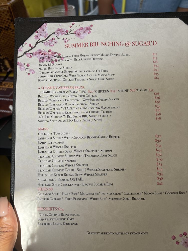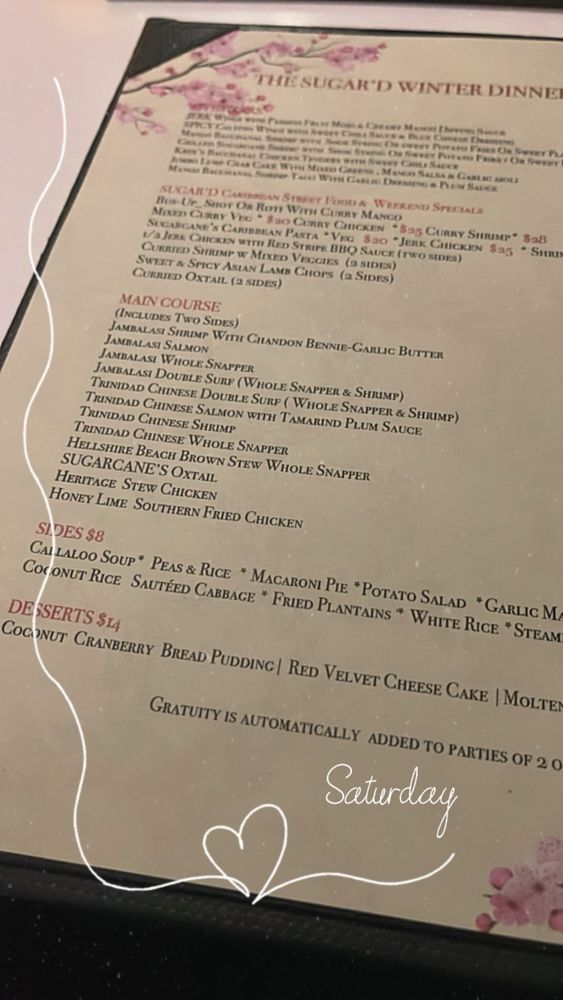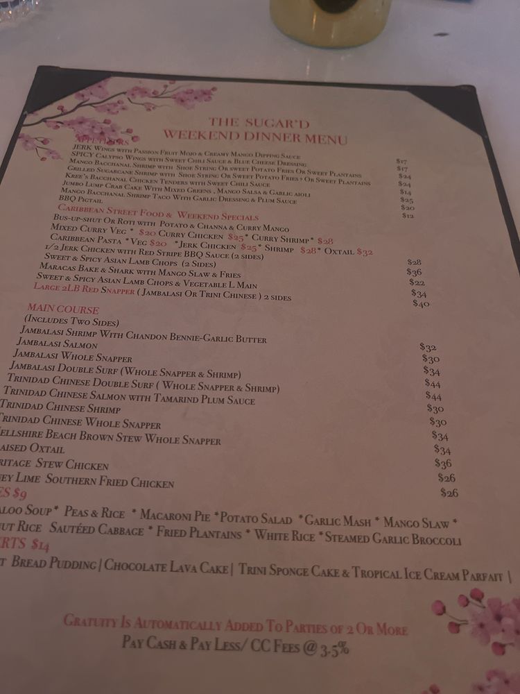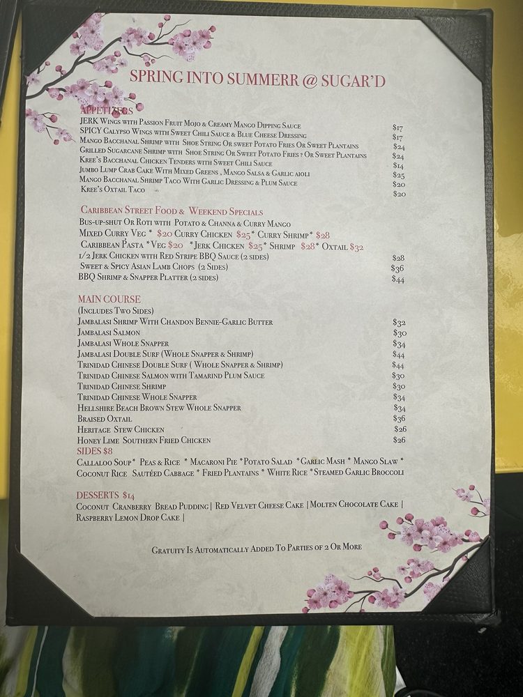 Introducing the menu at Sugar'd, a Caribbean gem in Brooklyn, NY offering classy vegetarian options. Customers rave about the rich and fresh Mango Slaw, flavorful Salmon, garlic mash, and delectable crab cake with Mango chow. The oxtail, rice, and peas are perfectly seasoned, while the sweet chili shrimp and jerked chicken are also highlights. The ambiance is praised for special occasions, with colorful planters adding to the vibrant decor. Despite some hits and misses with drinks, the flavorful food and lively atmosphere make Sugar'd a must-try. Don't miss the happy hour vibes and delicious dishes that capture the essence of Caribbean cuisine.